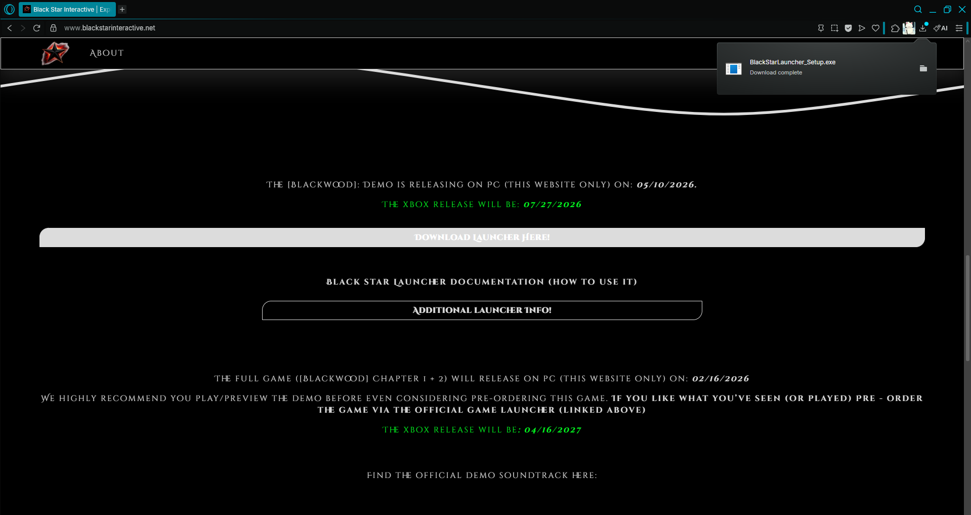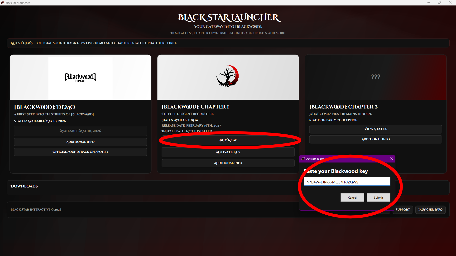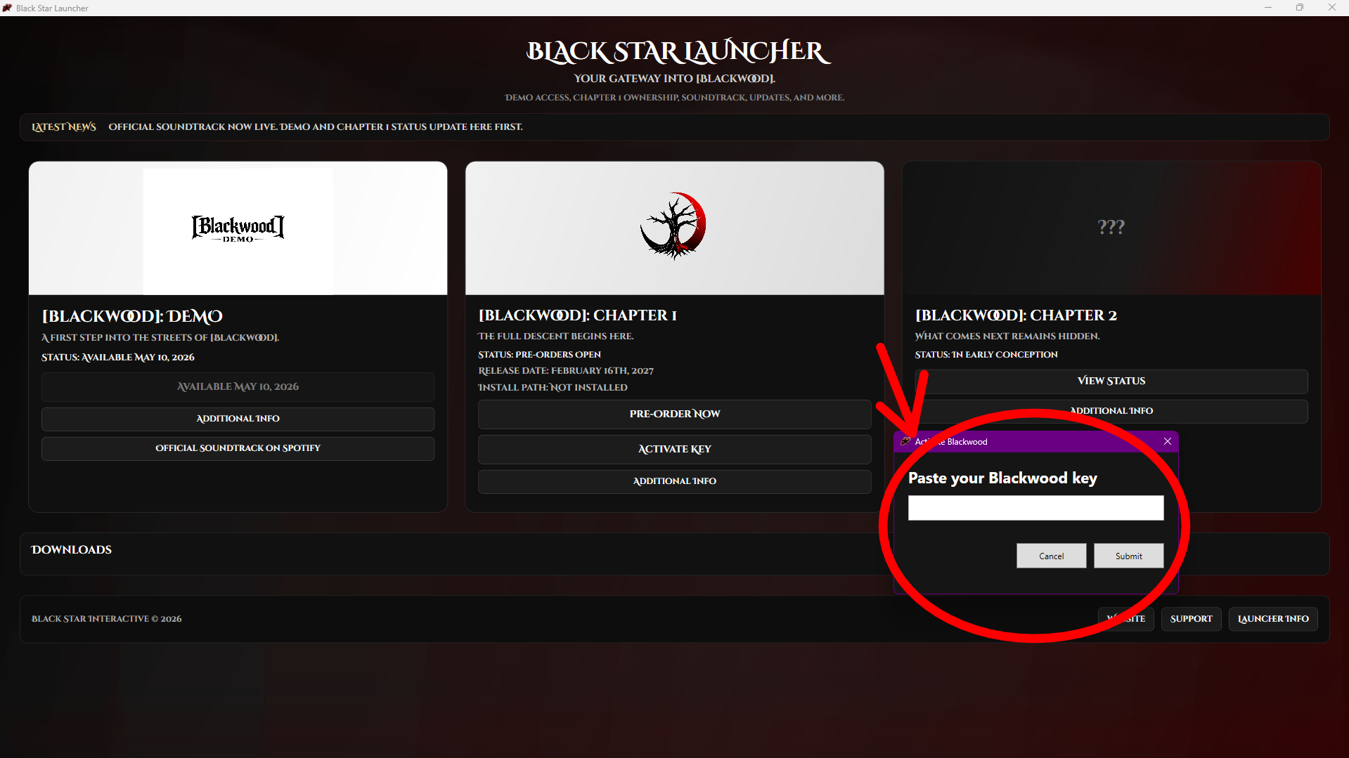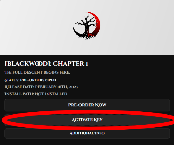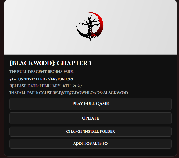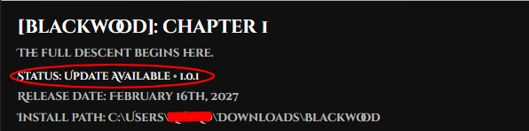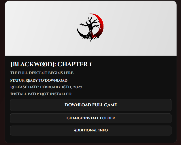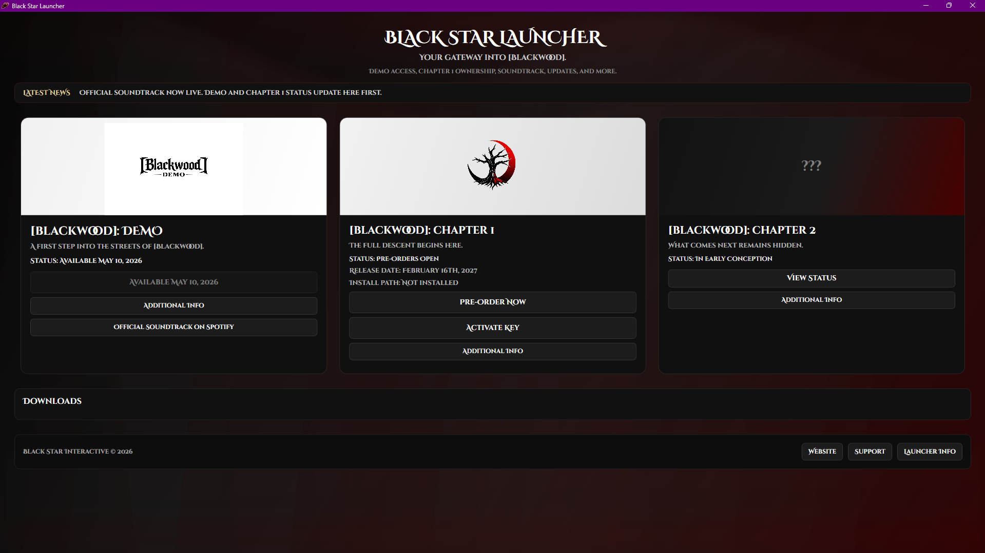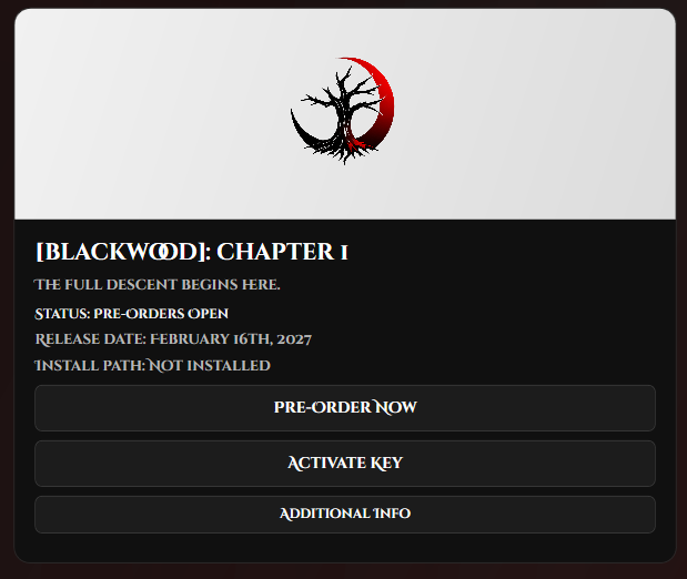 The Black Star Launcher is your main hub for everything related to [Blackwood]. It’s where you’ll be able to check the status of the demo and full game, download available releases, activate your key, install updates, and launch the game once it’s installed. Right now, it also works as a place to stay up to date while waiting for [Blackwood]: Chapter 0 and the demo to officially release.